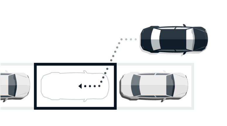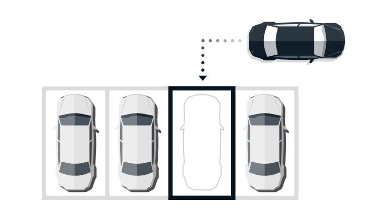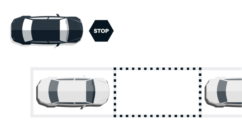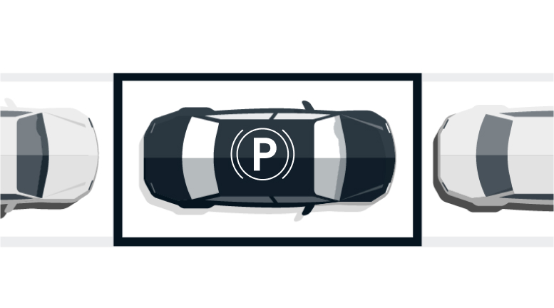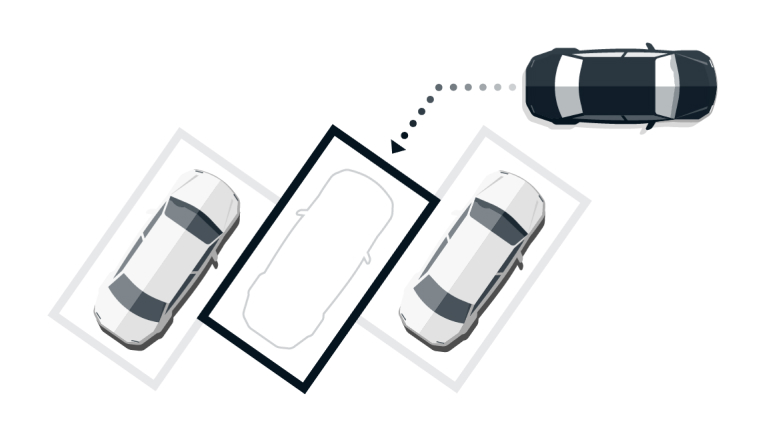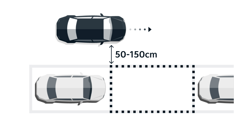 To find a parking space, keep a distance of 1.5 m to 0.5 m from the parking line and proceed slowly at a speed of 20 km/h or less.