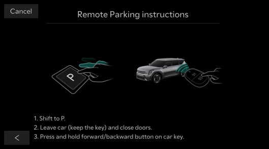 Put the gear in P, take the Smart Key, exit the vehicle and close all doors. Press and hold the forward or reverse button on the Smart Key to start the function.